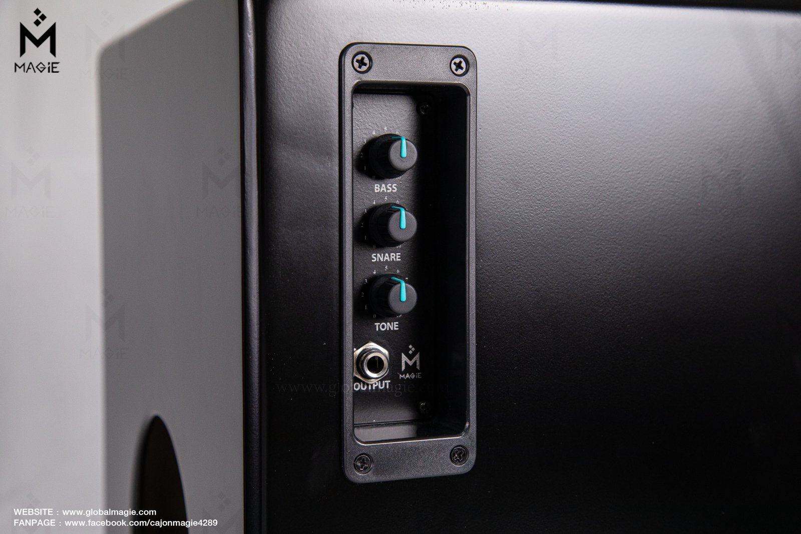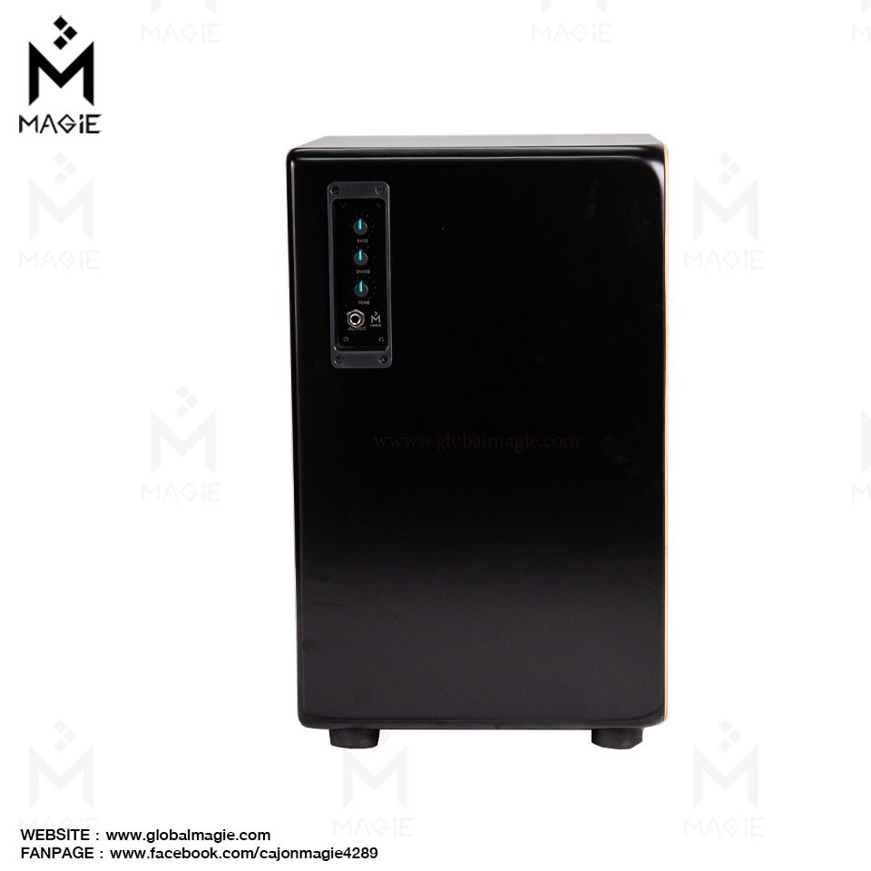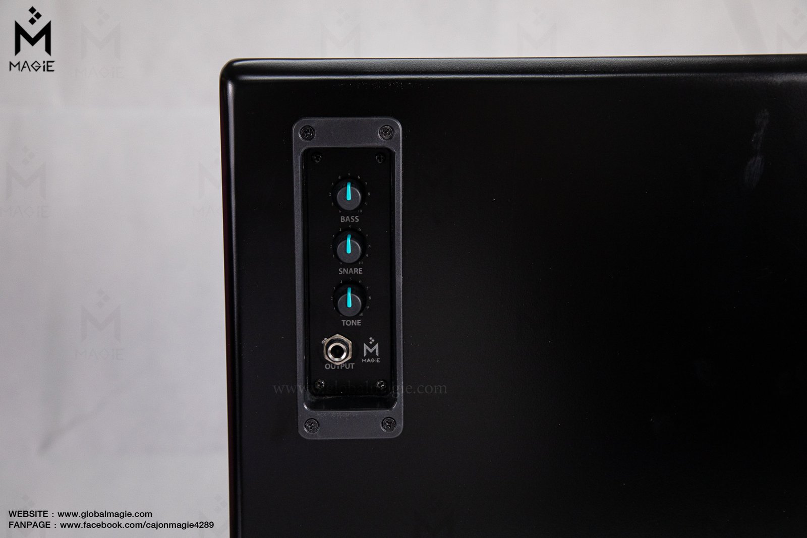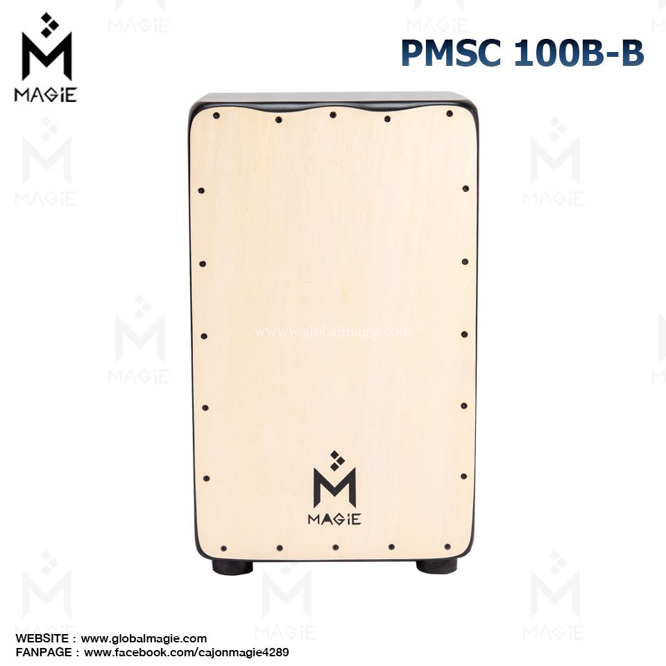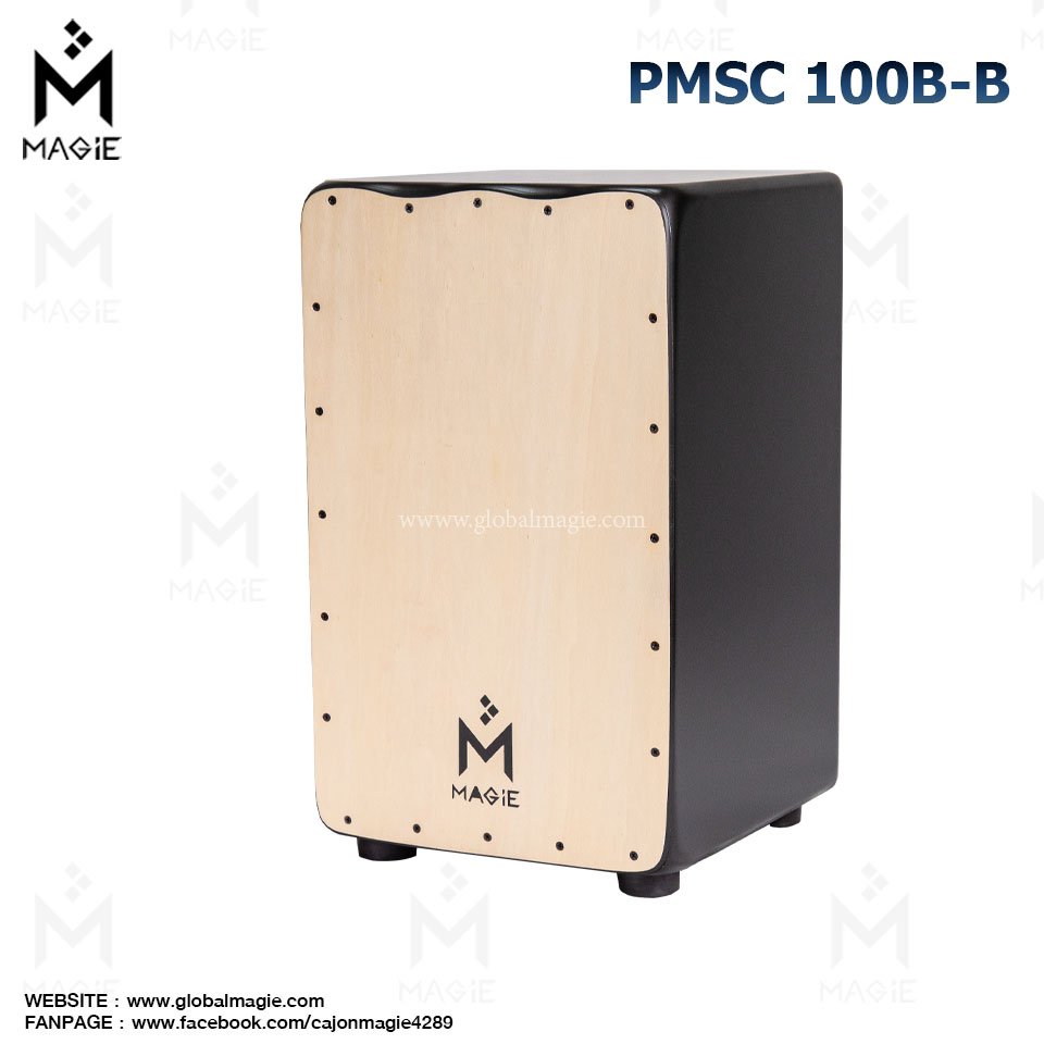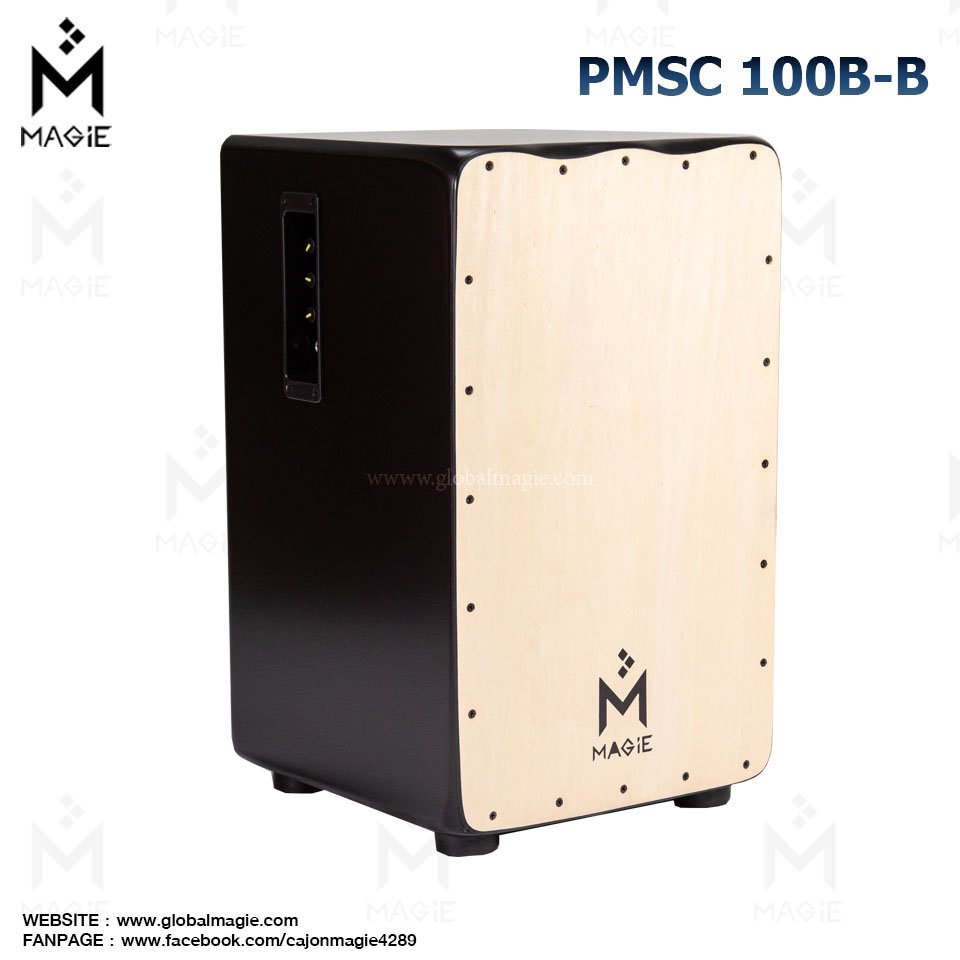 Magie Pickup Cajon Box Drum Series Plus  รุ่น PMSC 100B-B  เป็นกลองที่มีขนาด 11 3/4"x19 3/4"x11 3/4" ตัวถังไม้ Medium Density Fiberboard (MDF) ผ่านมาตราฐาน CARB-P2 ทำสี Polyurethane สีดำด้าน แผ่นหน้าวีเนียร์ไม้อัด 5 ชั้น ไม้เบริช์ ทำสี Polyurethane สีธรรมชาติลายไม้